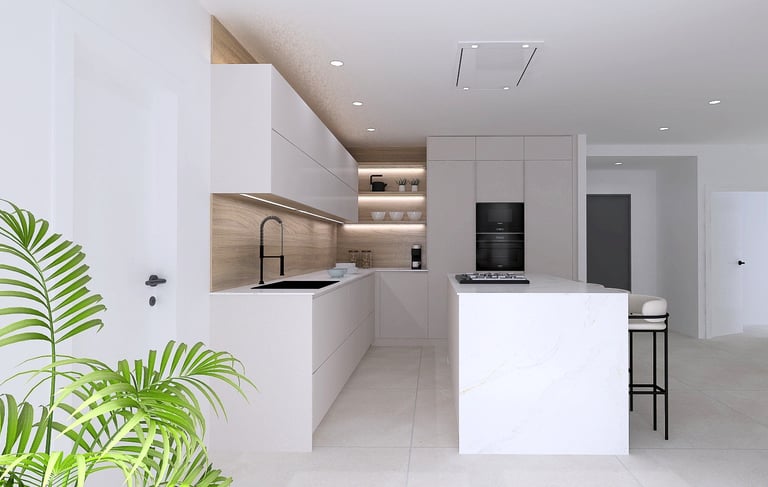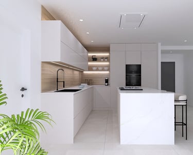 Light defines this culinary space. A serene white palette and a contrasting wood-laminate island are meticulously animated by hidden illumination, creating a dynamic play of shadow and reflection. The result is a kitchen that feels both expansively bright and intimately warm.