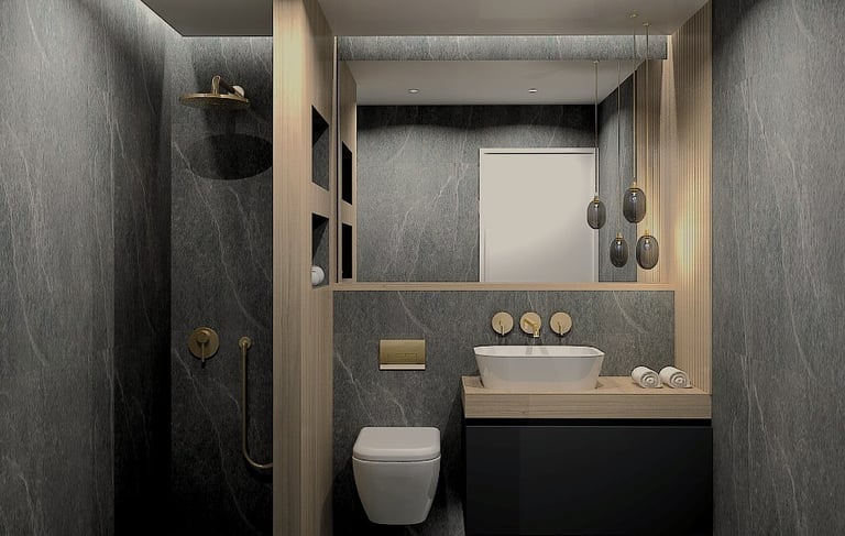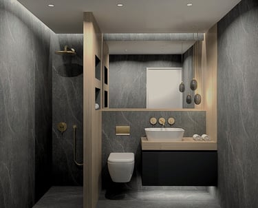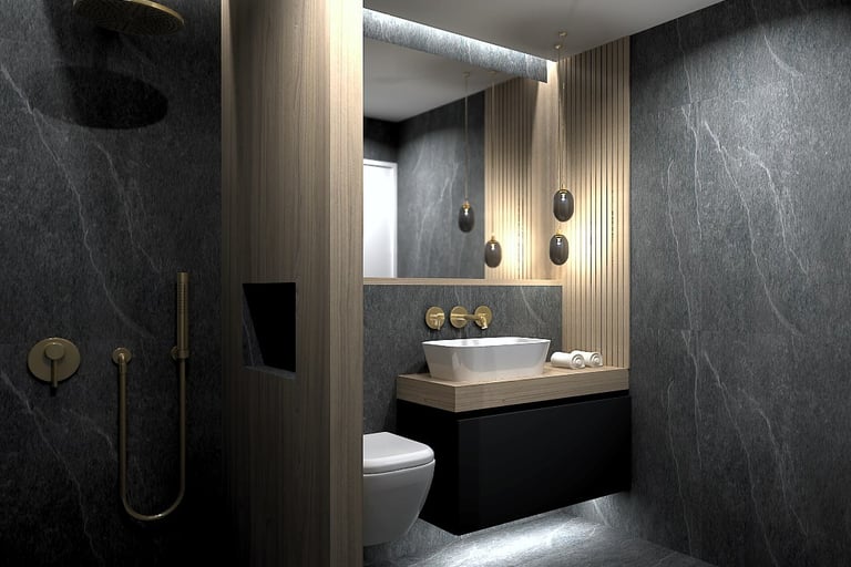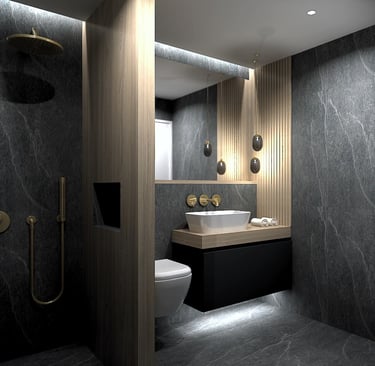 Embracing the latest in material innovation, this bathroom redefines coastal elegance. Voluminous black porcelain sets a serene, graphic foundation, expertly segmented by a monolithic black marble wall. The introduction of brushed gold tapware provides a warm, tactile counterpoint. Designed for the discerning client who seeks harmony between avant-garde trends and enduring quality, the space is a masterclass in creating a personalized spa experience that feels intrinsically connected to its Mediterranean setting.